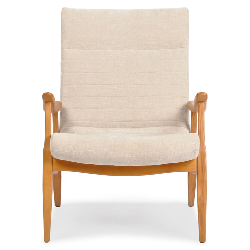 Natural wood, faux leather and a soft linen-like fabric combine in this elegant and warm accent chair. Featuring a pillowy back and a generous seat, Kenari packs good looks and comfort into one modern silhouette.